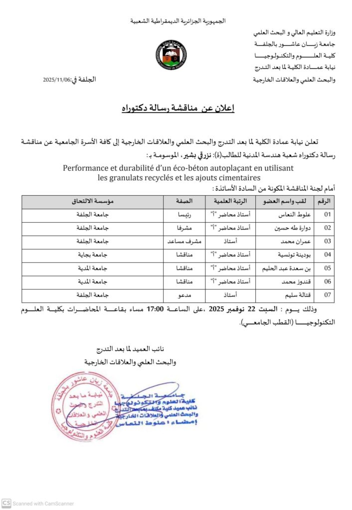 إعلان مناقشة دكتوراه للطالب نزرقي بشير