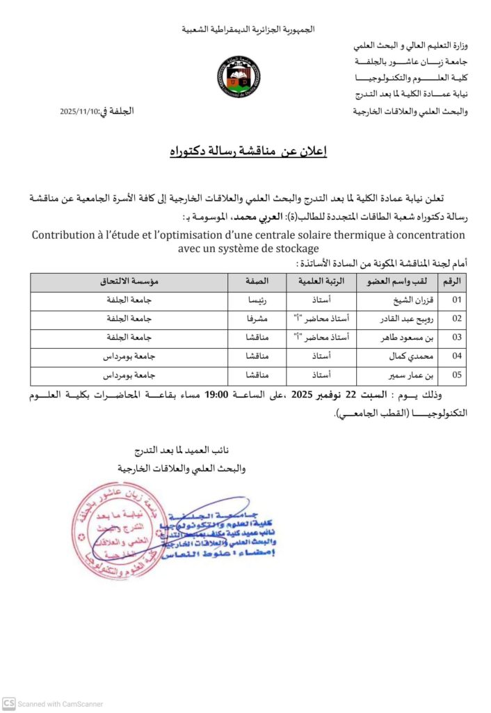 إعلان مناقشة دكتوراه للطالب العربي محمد