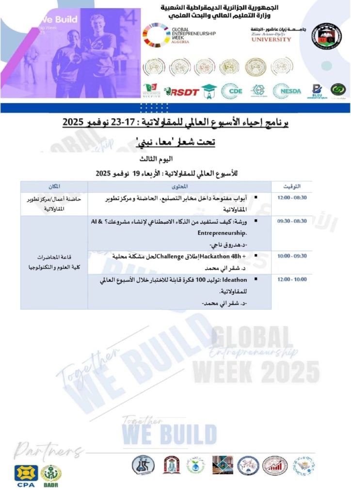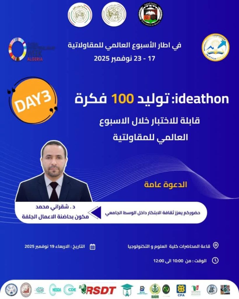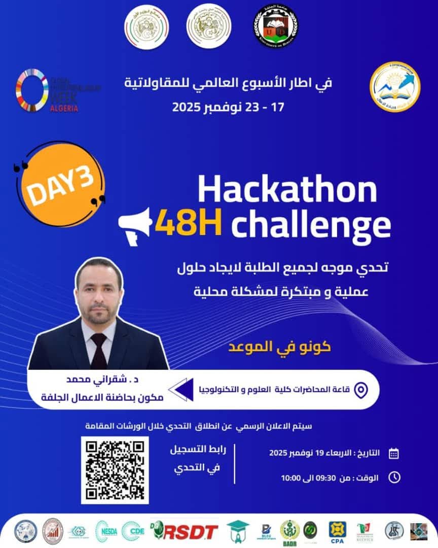- في إطار الأسبوع العالمي للمقاولاتية 2025، يُفتتح باب المشاركة في Hackathon 48H Challenge ، وهو تحدٍّ موجّه لجميع الطلبة لابتكار حلول عملية ومبتكرة لمشكلة محلية سيتم تقديمها للمشاركين.✔️ التسجيل مفتوح الان للمشاركة✔️ بعد غلق التسجيل، سيتم إرسال موضوع المشكلة وتعليمات المشاركة عبر البريد الإلكتروني✔️ يمتلك كل مشارك 48 ساعة كاملة لإعداد فكرته أو مشروعه وإرسال الحل النهائي✔️ المشاركة فردية وعن بُعد👈 سجّل الآن وكن جزءاً من صناعة التغيير داخل مجتمعك الجامعي.