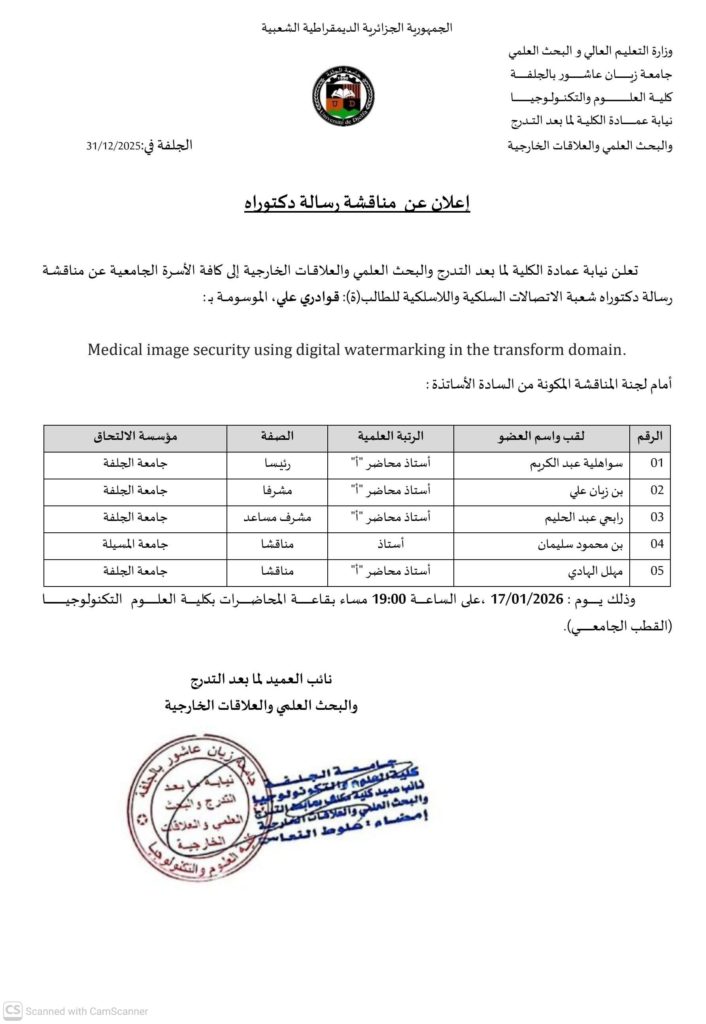 إعلان مناقشة دكتوراه للطالب قوادري علي