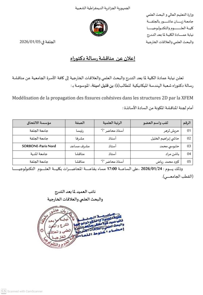إعلان مناقشة دكتوراه للطالبة بن قليل أمينة