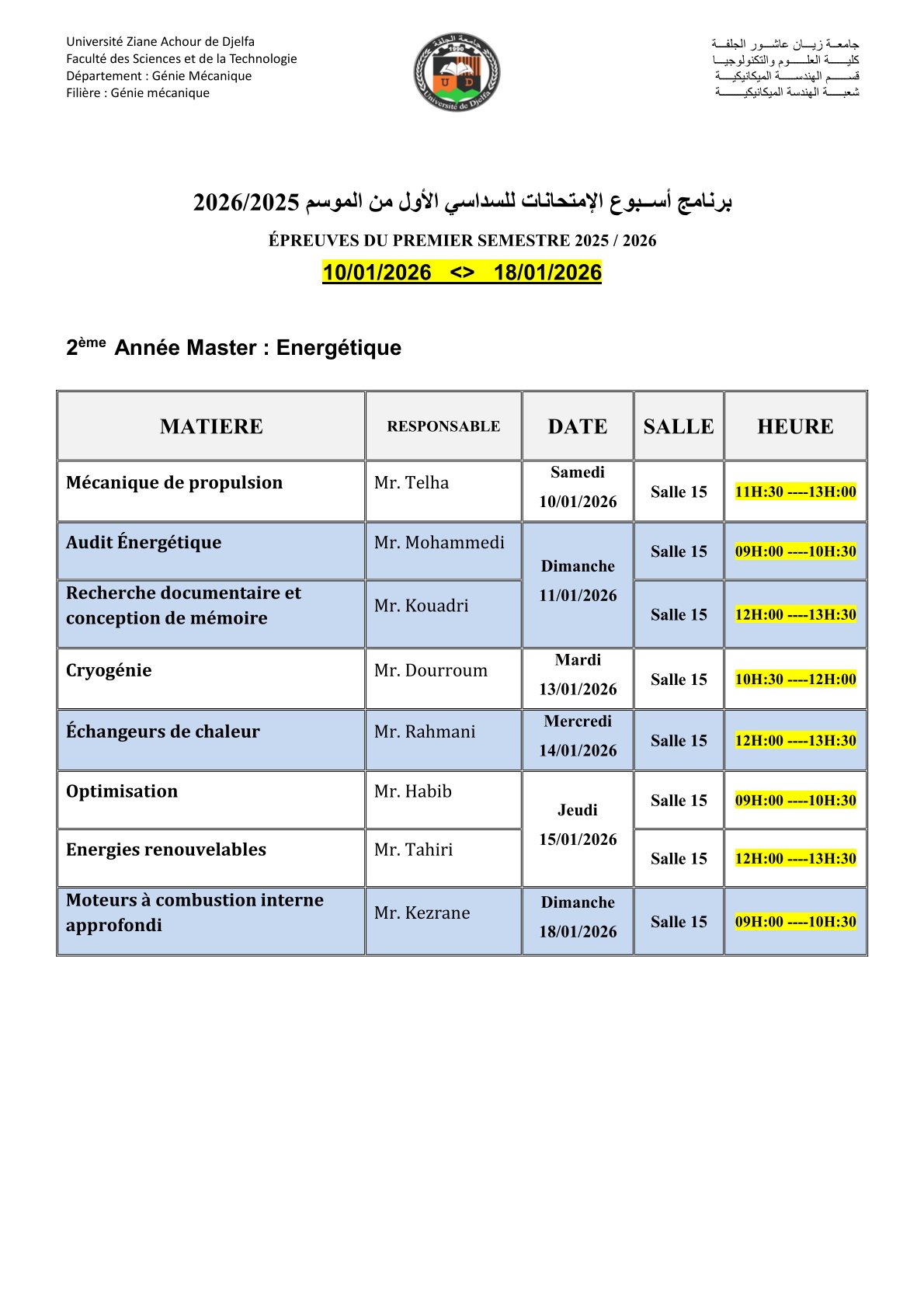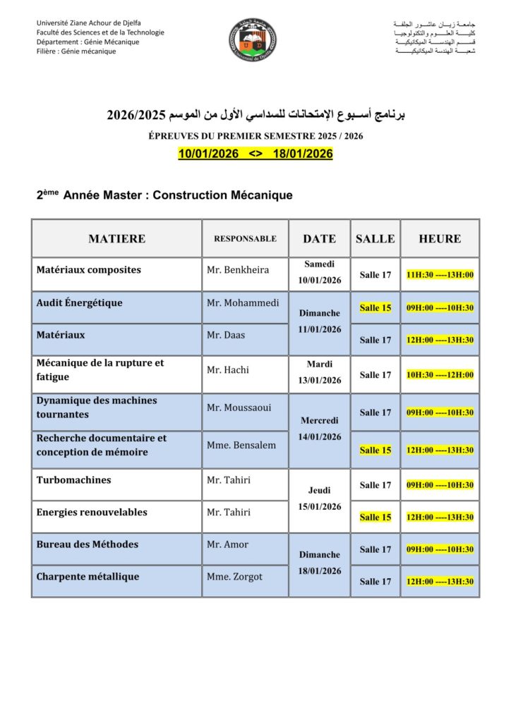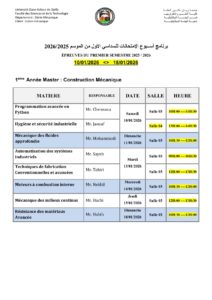 تحيين برامج الامتحانات قسم الهندسة الميكانيكيةبعد التصحيحقسم الهندسة الميكانيكية / بواسطة FST برامج الامتحانات المحينة لتخصصات M1ERM, M1CM, M2CM, M2EN وذلك بعد تصحيح اخطاء في إسناد المقاييس