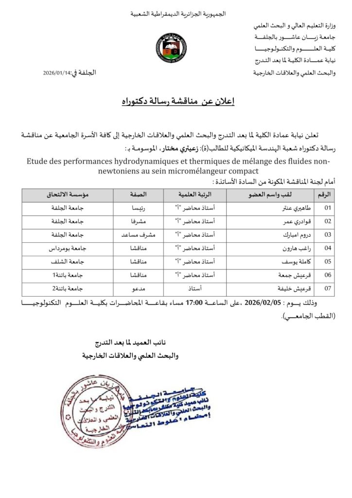 إعلان مناقشة دكتوراه للطالب زعيتري مختار