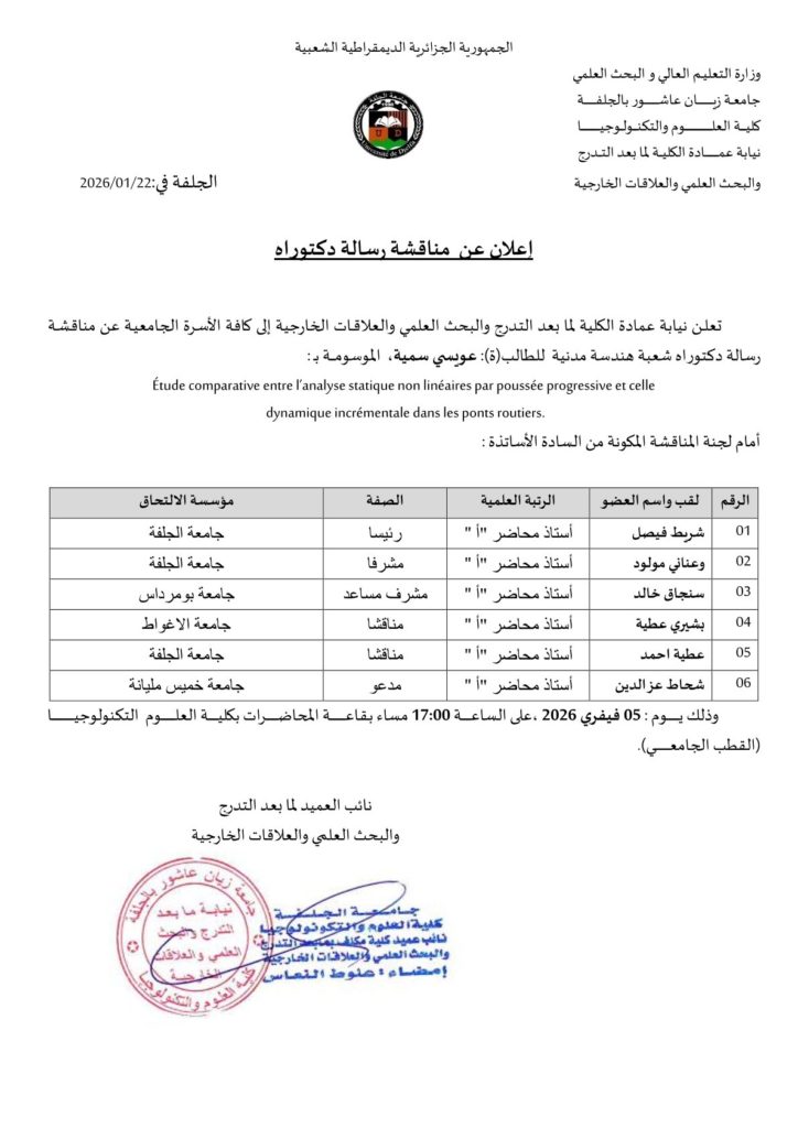 إعلان مناقشة رسالة دكتوراه للطالبة عويسي سمية