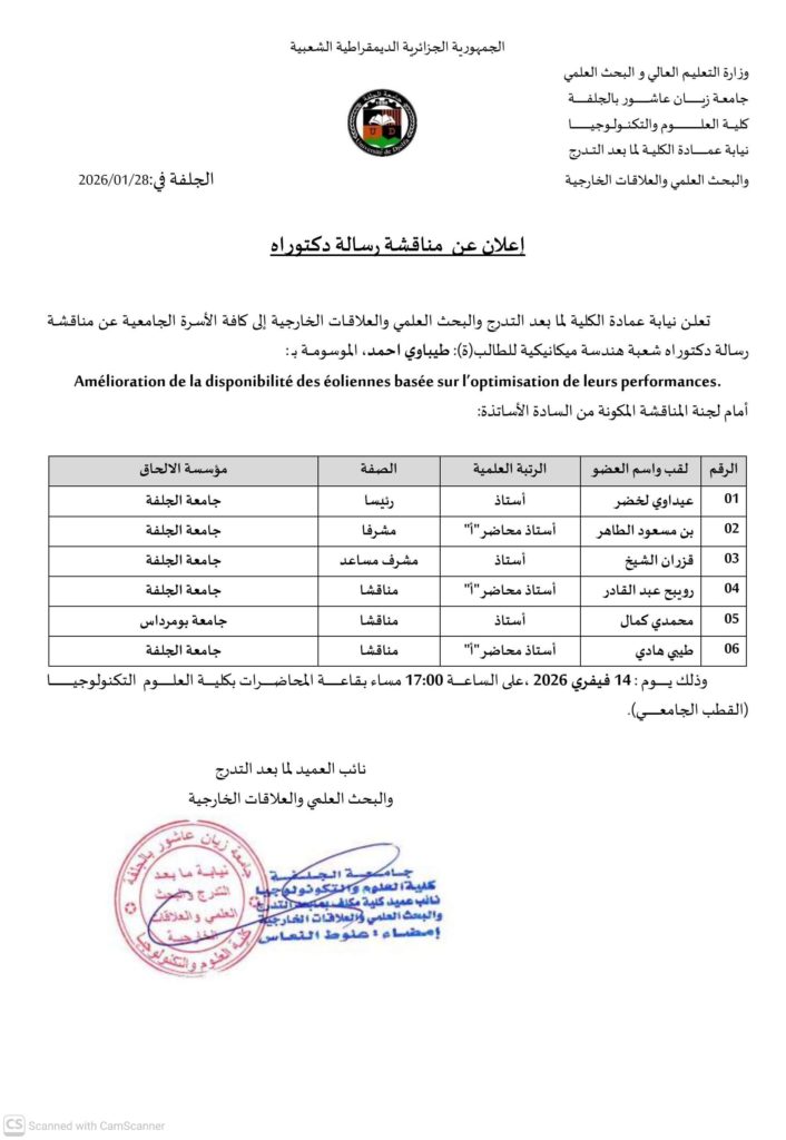 إعلان مناقشة دكتوراه للطالب طيباوي أحمد