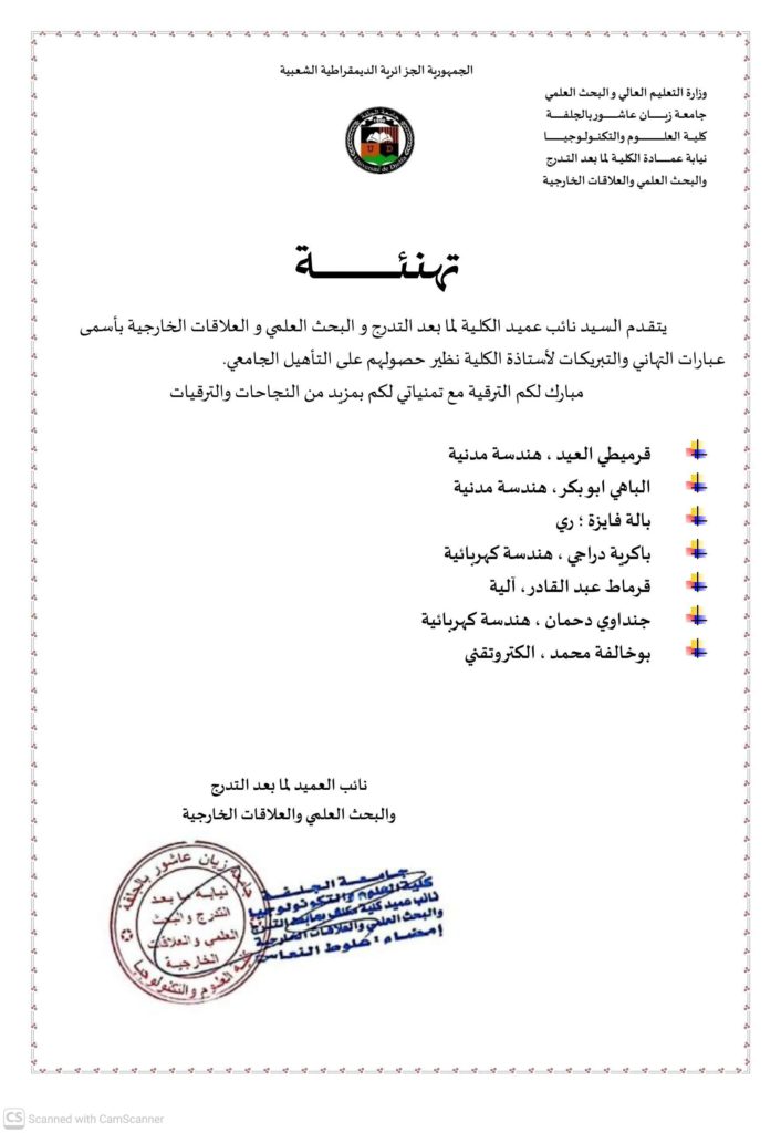 تهنئة للأساتذة بمناسبة الترقية للتأهيل الجامعي
