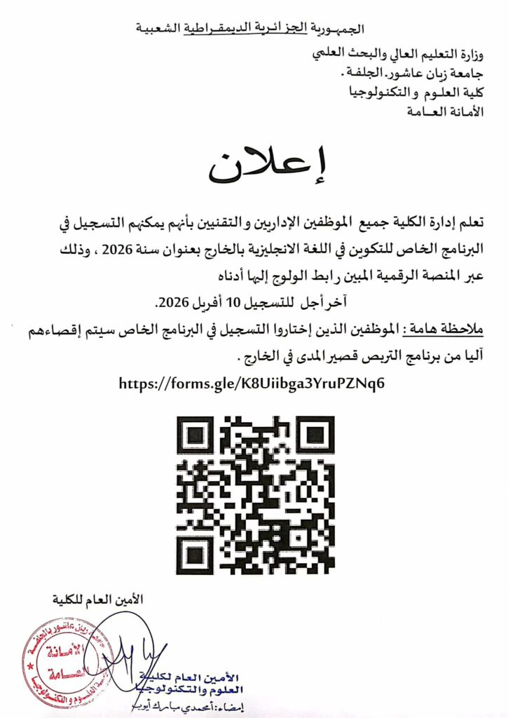 إعلان الاداريين و التقنيين بخصوص التسجيل في برنامج التكوين في اللغة الانجليزية بالخارج لسنة 2026إعلانات / بواسطة FST https://forms.gle/K8Uiibga3YruPZNq6